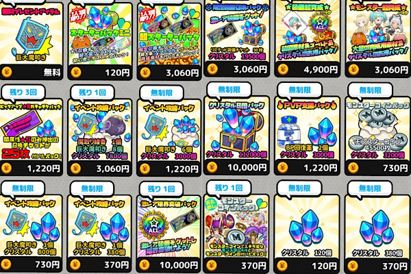 モンスターバスケットでは、モンスターの召喚やアイテムと交換するときに使う『クリスタル』を課金によって購入することができます。
