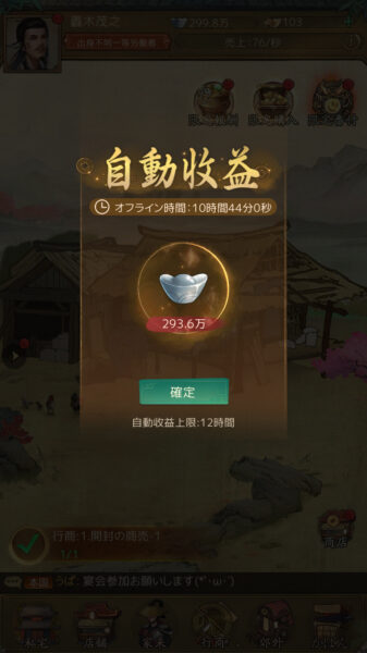 商人放浪記 - あきんどの成り上がり道では、放置報酬機能が搭載されていてオフライン状態の時間に合わせて報酬を受け取ることができます。